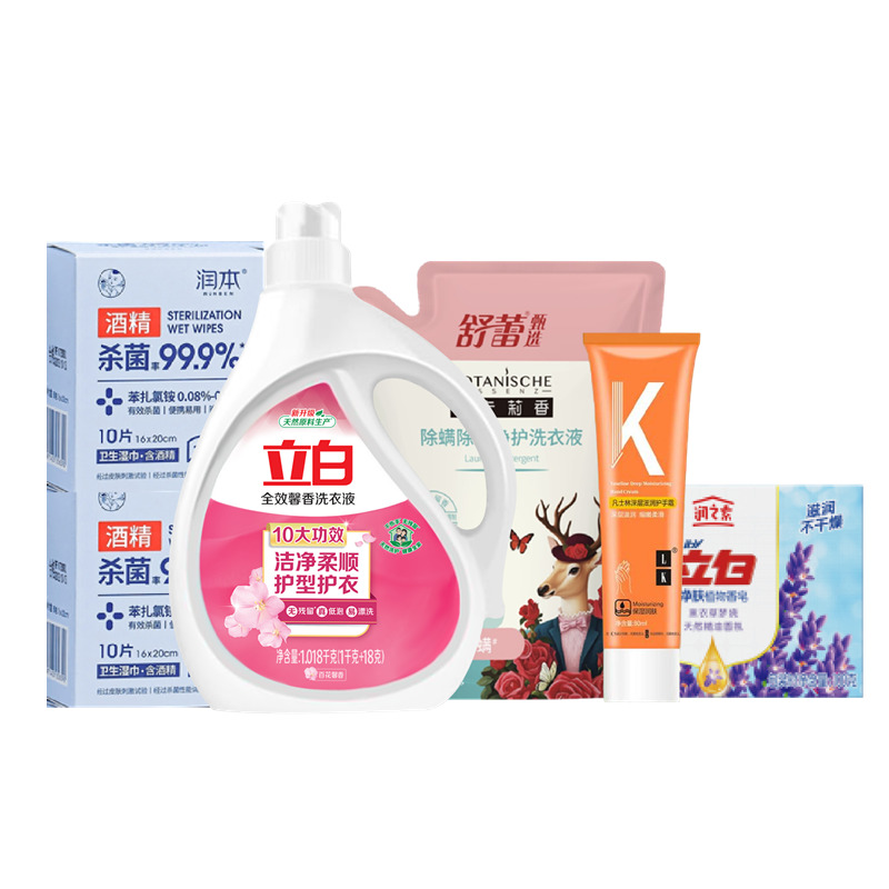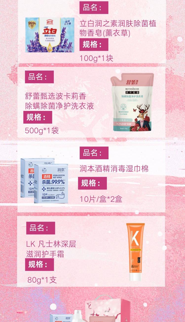 配置: 立白全效馨香洗衣液1.018kg*1瓶 立白潤之素潤膚除 菌植物香皂(薰衣草)100g*1塊 舒蕾甄選波卡莉香除螨除 菌凈護洗衣液-500g*1袋 潤本酒精消毒濕巾棉10片/盒*2盒 LK 凡士林深層滋潤護手霜 80g*1支 核心賣點: 可選產(chǎn)品豐富多樣,禮箱隨心組合,多種價位因需而定,充分滿足各種送禮需求,是商務送禮、單位福利的用心之選。