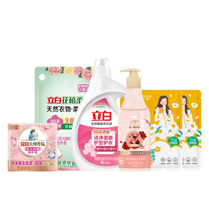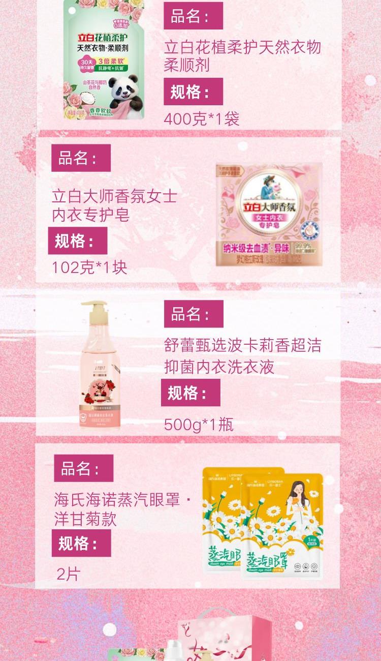 配置: 立白全效馨香洗衣液1.018kg*1瓶 立白花植柔護(hù)天然衣物柔順劑400克*1袋 立白大師香氛女士內(nèi)衣專護(hù)皂102克*1塊 舒蕾甄選波卡莉香超潔抑 菌內(nèi)衣洗衣液-500g*1瓶 海氏海諾蒸汽眼罩·洋甘菊款*2片 核心賣點(diǎn): 可選產(chǎn)品豐富多樣,禮箱隨心組合,多種價(jià)位因需而定,充分滿足各種送禮需求,是商務(wù)送禮、單位福利的用心之選。