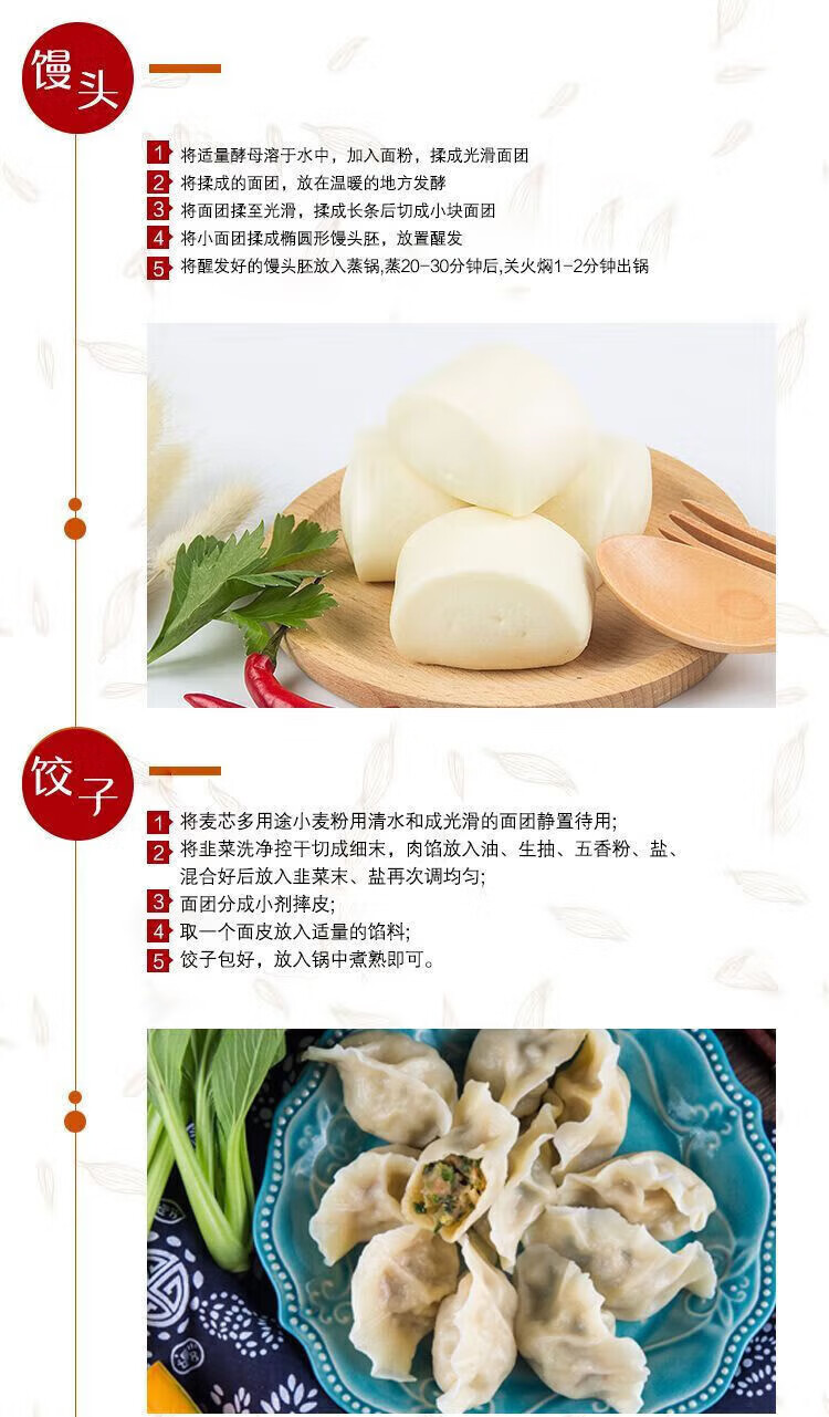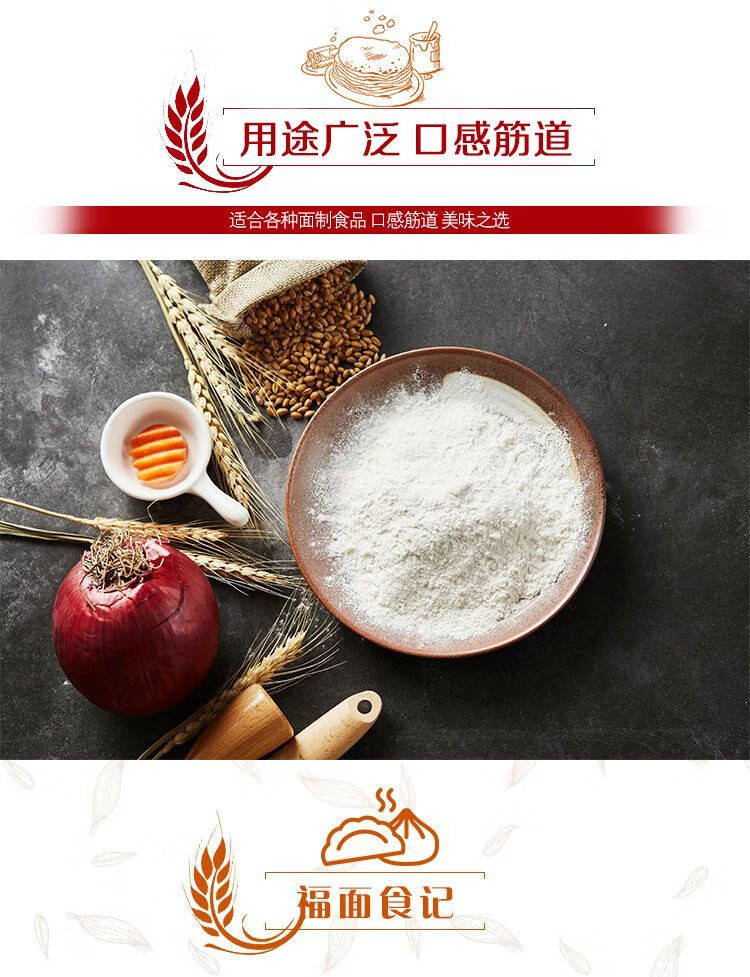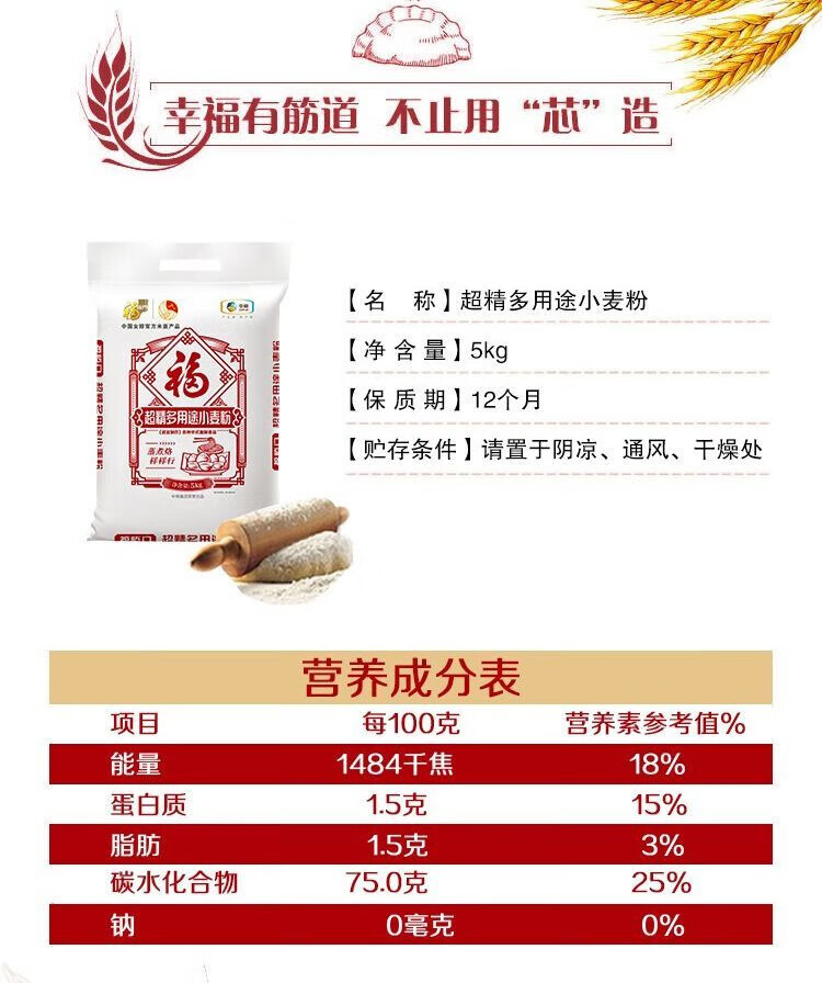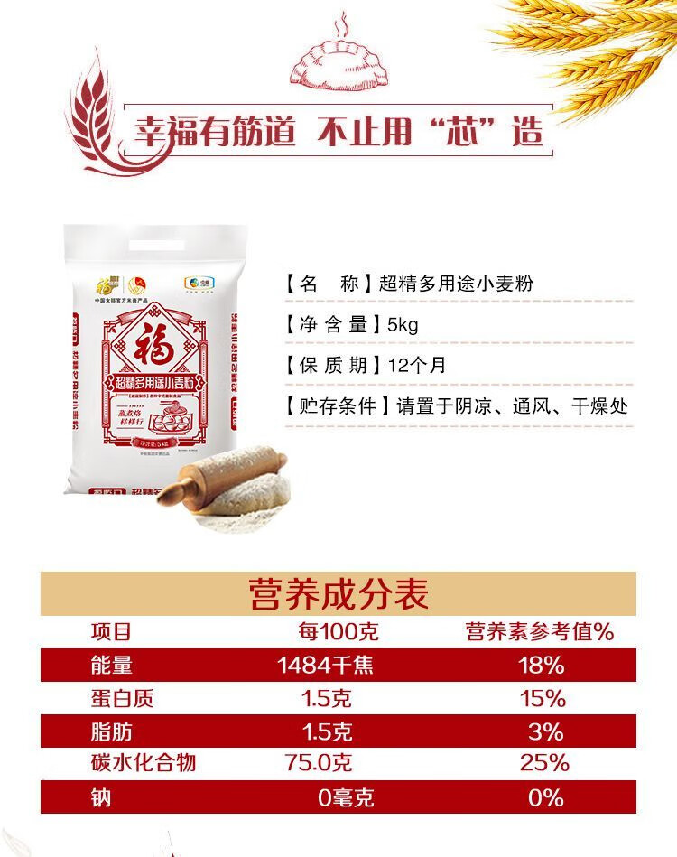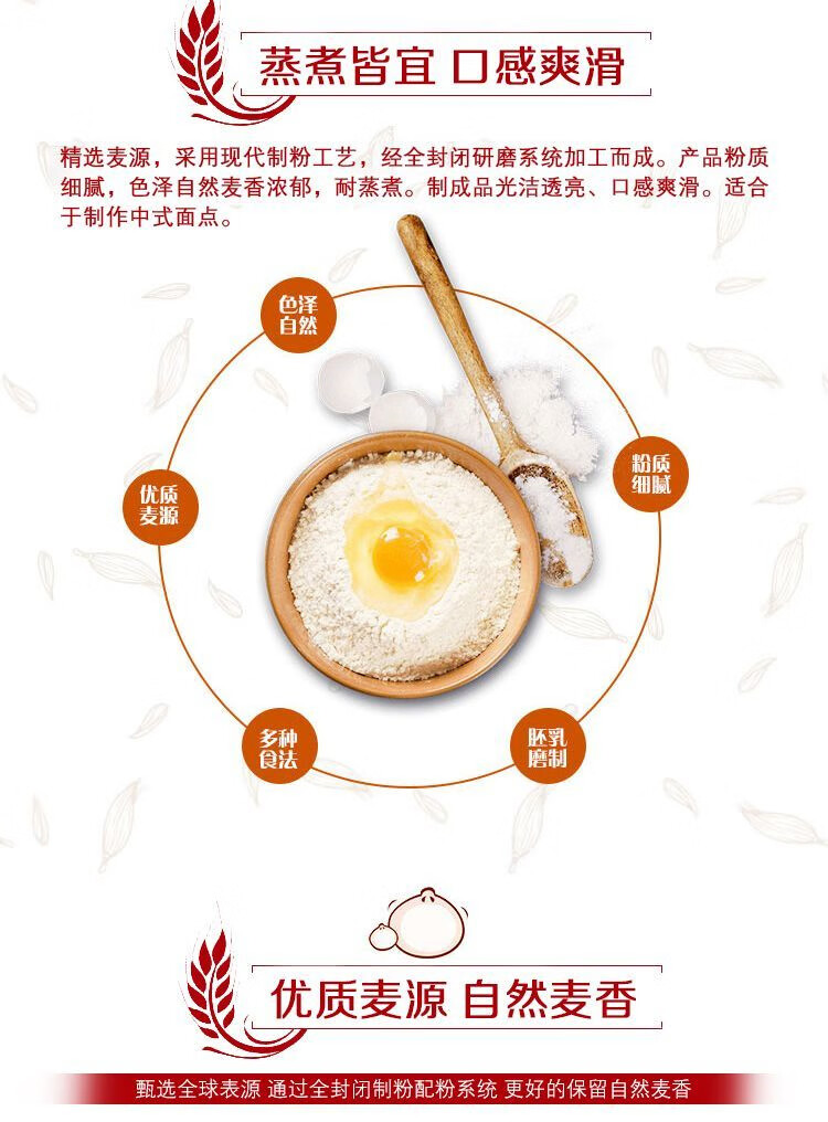 凈含量:5kg 條形碼:6944910370621 開(kāi)票稅率:9% 產(chǎn)品賣點(diǎn): 央企全鏈管控,安全品質(zhì)有保障;精選核心產(chǎn)區(qū)麥源,多道精研麥香濃多系列適配全場(chǎng)景,面食筋道易操作。